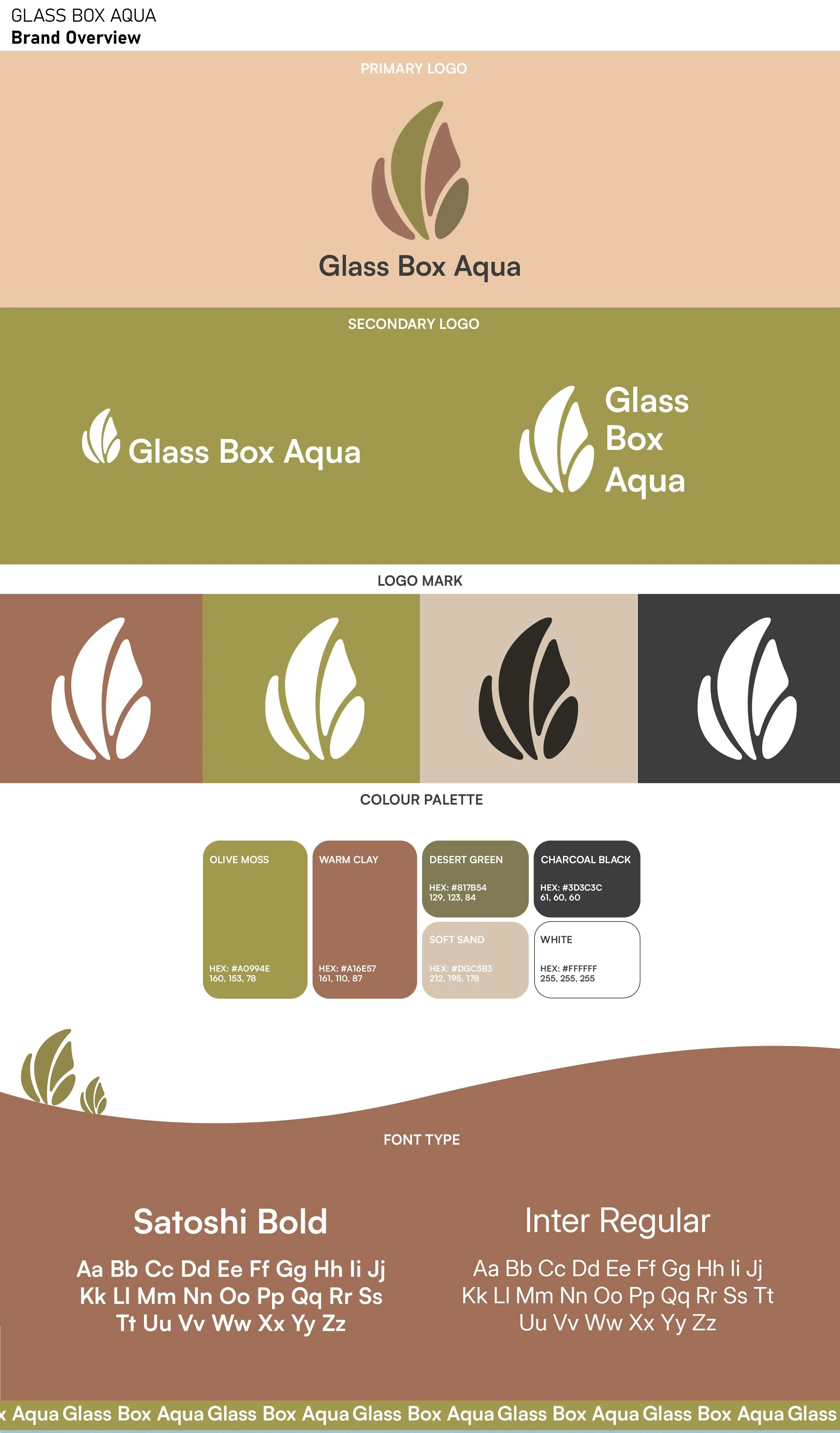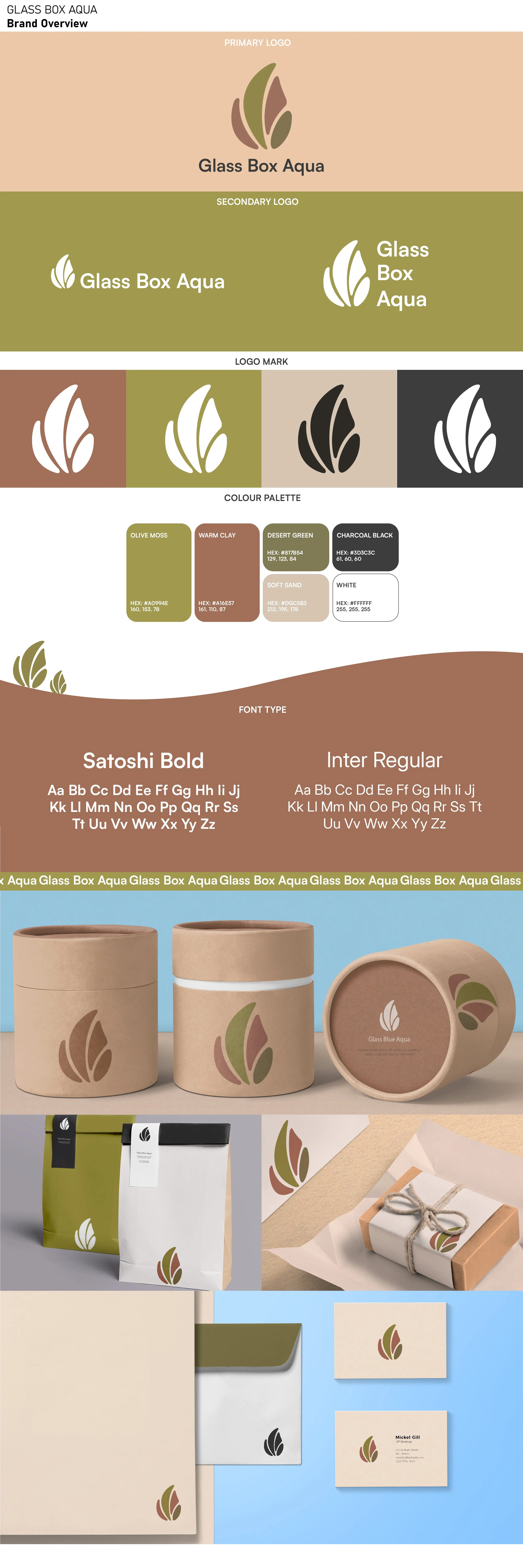 GlassboxAqua is a startup selling gear and aquatic plants for aquarium hobbyists. The founder had a name—but needed a full visual identity. I designed three logo options and brand mockups, exploring styles from modern minimalism to organic elegance.