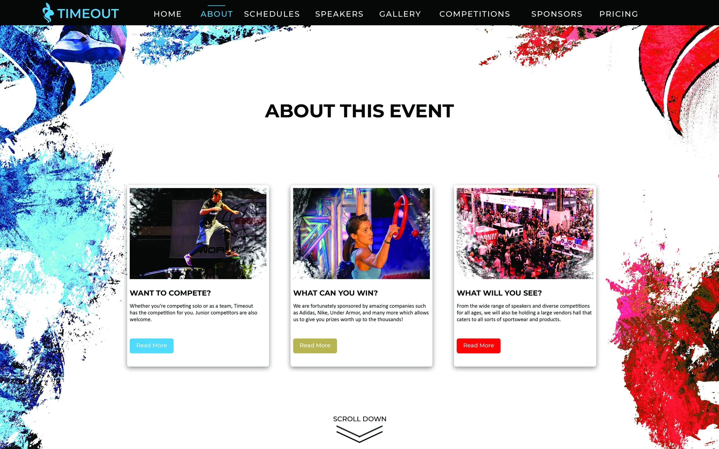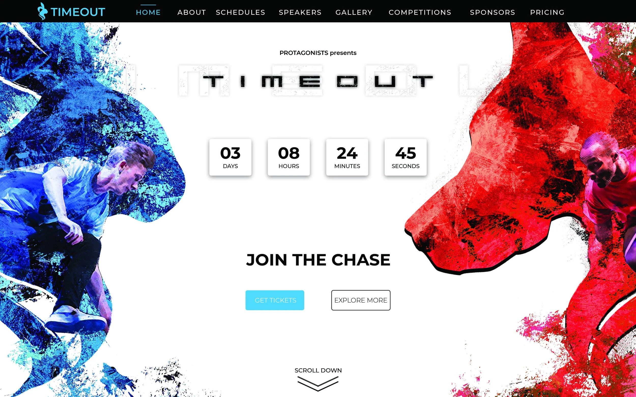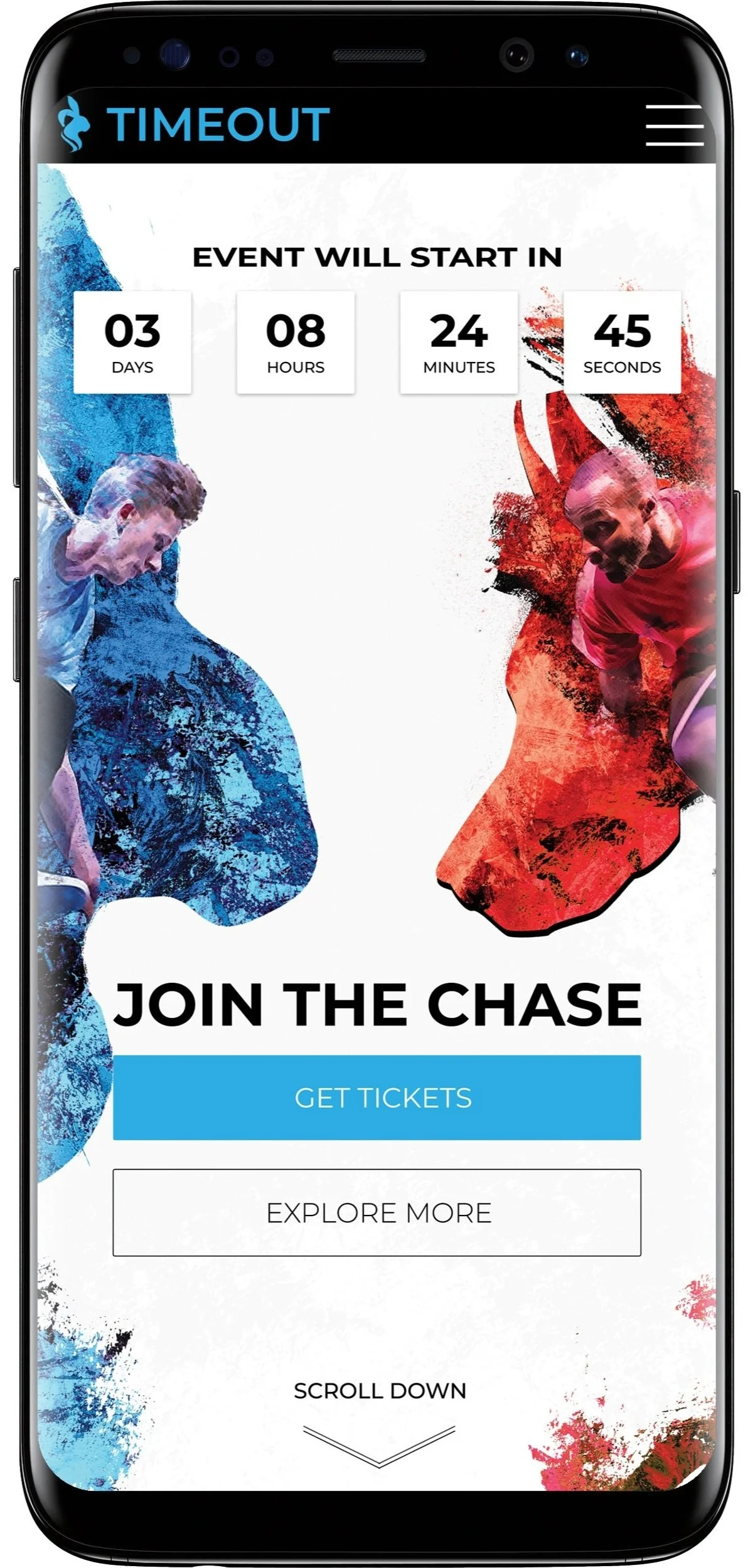 The website expands on the Timeout identity using the same striking imagery. The CTA (Call to Action) "Join the Chase" invites users to compete or spectate, immersing them in the world of professional chase tag. A live countdown timer builds anticipation, reinforcing the event's fast-paced nature—just like the actual game, the clock is always running.